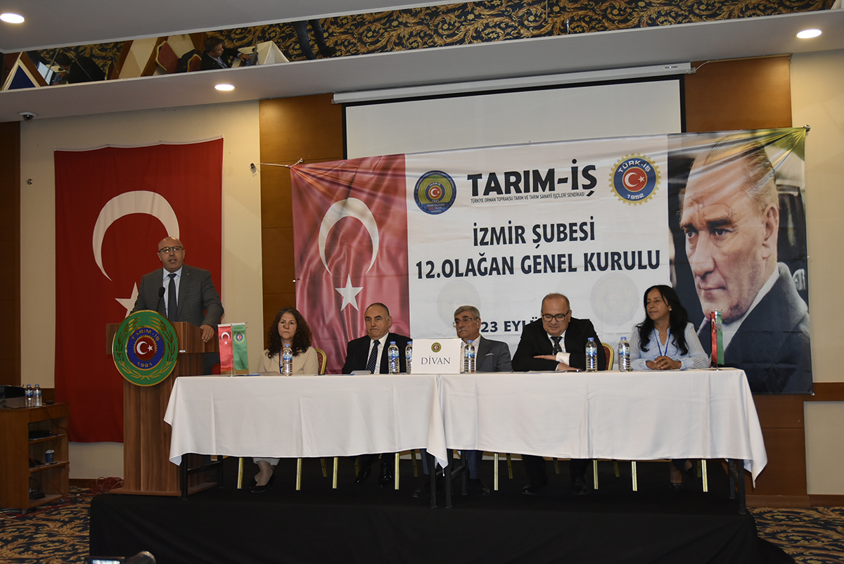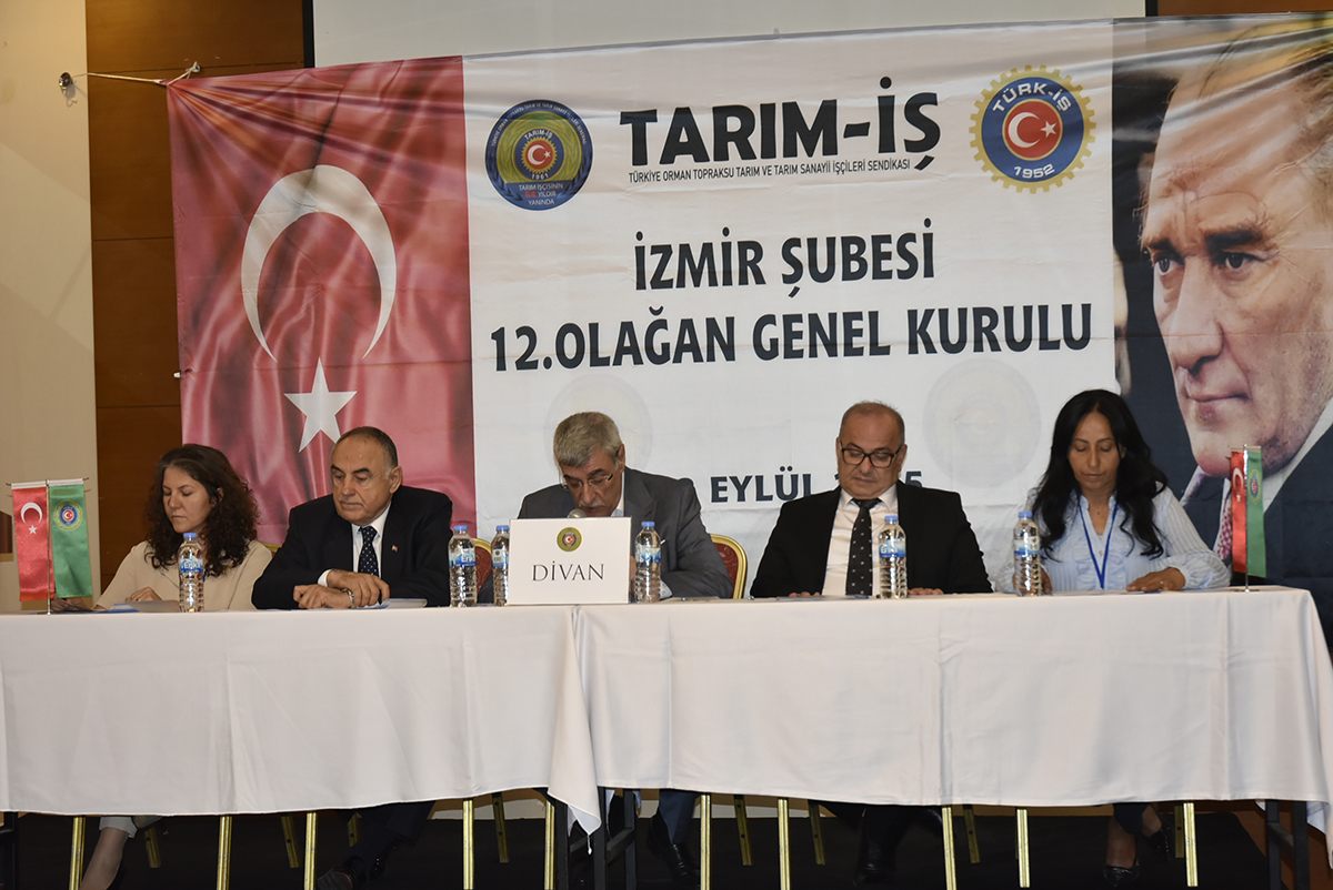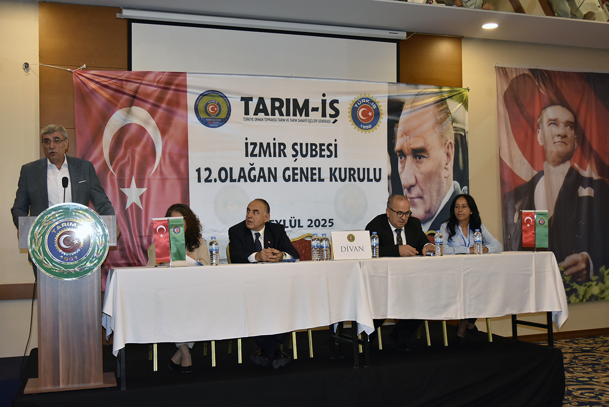 Tarım-İş Sendikası İzmir Şubesi 12. Olağan Genel Kurulu 23 EYLÜL 2025 Salı günü Ege Üniversitesi Kampüsü Erzene Mahallesi BORNOVA/İZMİR adresinde bulunan Anemon Ege Sağlık Hotel Toplantı Salonunda yapıldı. Başkanlık ve yönetim organları için tek aday listenin girdiği seçimlerde mevcut şube Başkanı Zafer ŞİŞMANLAR ve listesi seçimi kazanarak güven tazeledi.